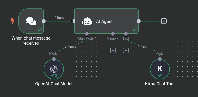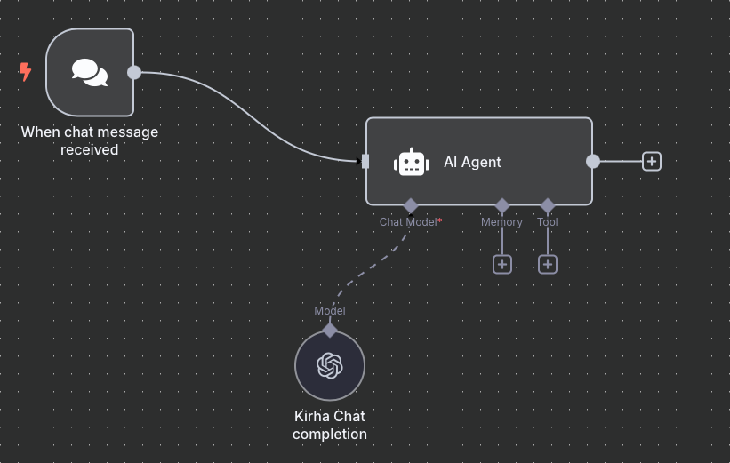With our n8n custom nodes, use Kirha as an agent-executable tool in n8n’s Agent Node. It’s ideal if you want an LLM to decide when and how to use Kirha for reasoning, answering user queries, or combining it with other tools.